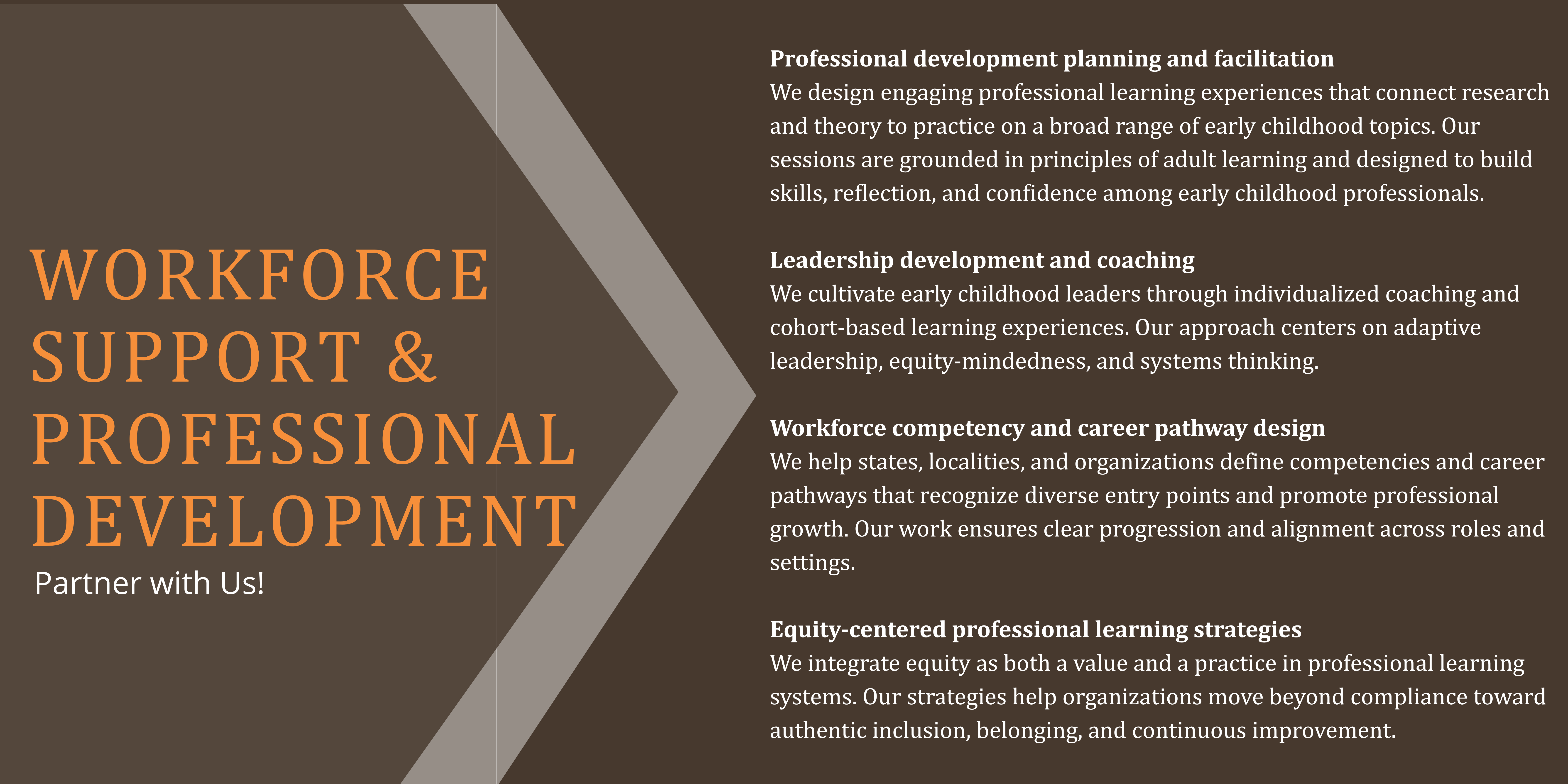 We support the early childhood workforce through research-based engaging professional learning experiences. Services include: